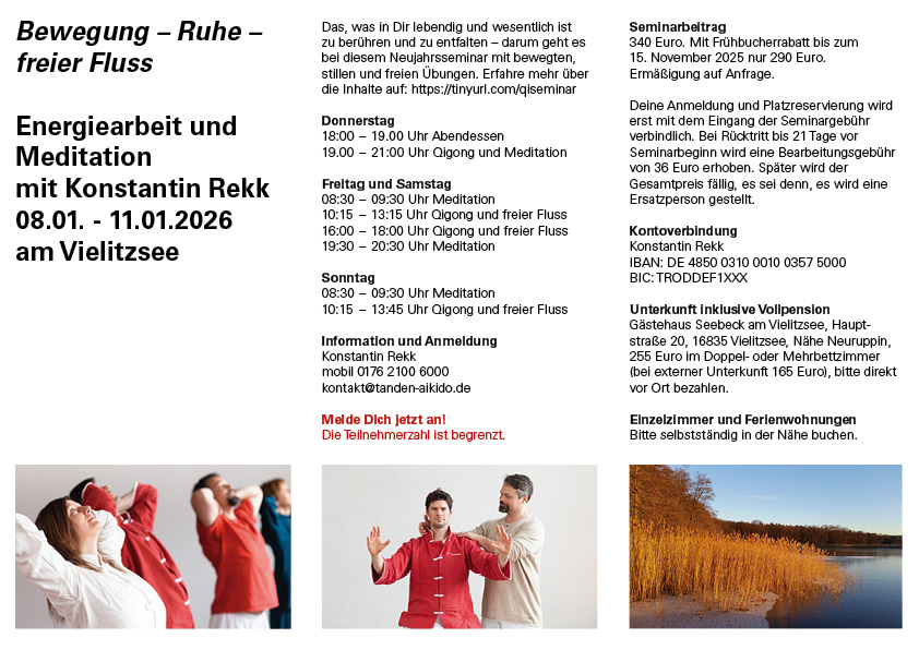 Es wird einerseits um intuitive Arbeit gehen: Wir erkunden spielerisch unterschiedliche Wege, um in die heilende Qi-Trance und den weiten Raum freier, natürlicher Präsenz einzutreten.